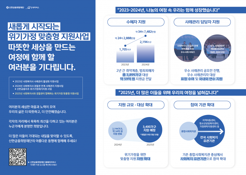 사회복지법인 굿네이버스는 신한금융희망재단과 사회복지공동모금회 지원으로 2025년 사회복지사와 경찰관이 함께하는 위기가정 맞춤형 지원사업을 아래와 같이 진행 및 공고하오니 많은 관심과 신청 바랍니다.