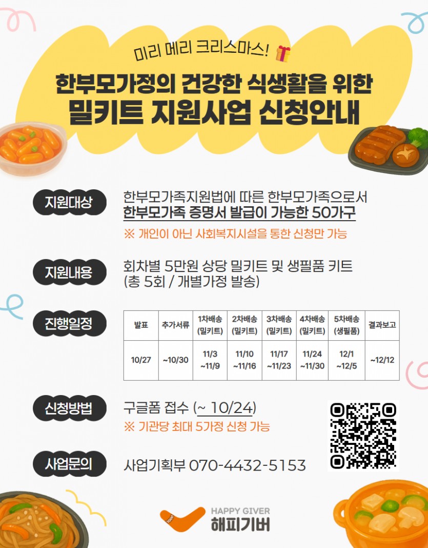 공모사업정보 [해피기버] 한부모가정 밀키트 지원사업 신청안내 (~10/24)